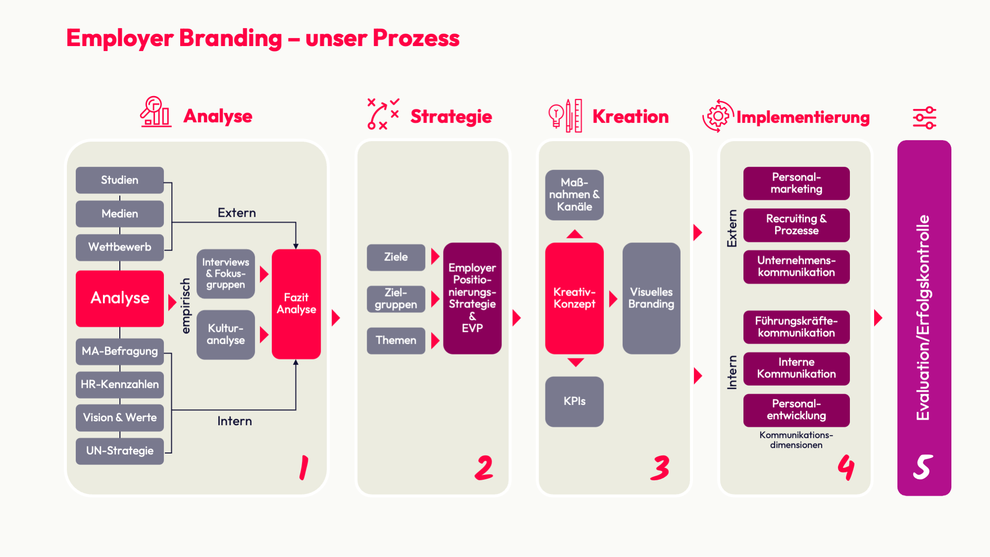 Engagierte Mitarbeitende bilden das solide Fundament für die langfristige Entwicklung von Unternehmen und Institutionen. Das Recruiting, die Gewinnung geeigneter Fach- und Führungskräfte sowie von qualifiziertem Nachwuchs, wird immer mehr zum erfolgskritischen Faktor. Wer im War for Talents bestehen will, braucht eine starke Arbeitgebermarke – und professionelle Kommunikation. Wir unterstützen Organisationen aller Größen beim Finden und Binden der Besten – mit unserem Purpose-orientierten Employer-Branding-Ansatz und maßgeschneiderten Kommunikationslösungen.